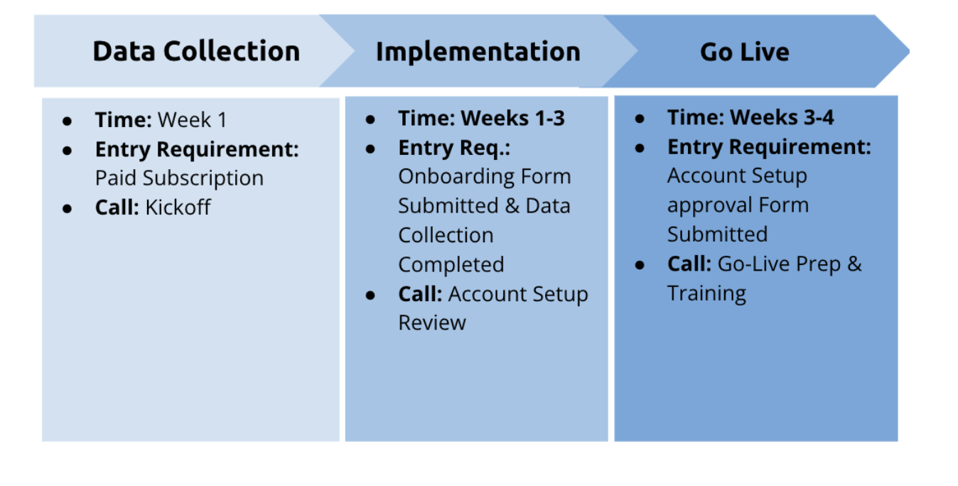 We typically allow up to 60 days for full implementation, but this timeline may vary depending on your business needs and the time invested in completing onboarding tasks. Please note that Essentials Onboarding extending beyond this 60-day window due to client delays may be subject to additional fees.